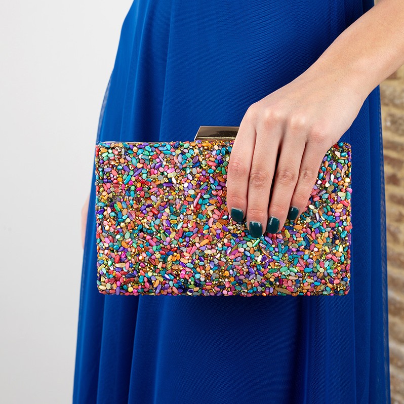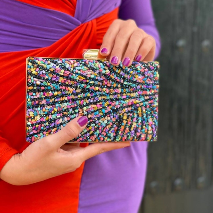 1. Clutch multicolor: Este tipo de bolso de fiesta es pequeño y compacto, lo que lo hace perfecto para llevar solo lo esencial.